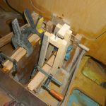 Простейший аналог клинового зажима можно изготовить за пару минут. Для этого берут два бруска сечением прибл. 20 на 20 мм и длиной около 20-25 см, посередине их сшивают шурупом или саморезом длиной не менее 60 мм, подложив под его шляпку широкую шайбу. Немного раскрутив шуруп, между брусков с одной стороны вставляют кусок дерева высотой чуть больше требуемого расстояния сжатия, а другая сторона становится рабочими губками струбцины. Закручивая шуруп, мы сводим губки, раскручивая – разводим. Работает!